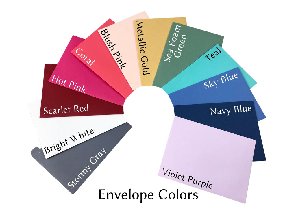 - Choose the envelope color for your stationery from these colors of A6 envelopes: Stormy Gray, Bright White, Scarlet Red, Hot Pink, Coral, Blush Pink, Metallic Gold, Sea Foam Green, Teal, Sky Blue, Navy Blue, or Violet Purple.